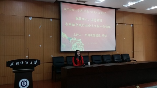 3月9日下午,全国道德模范董明做客公司第169期“阳光人文讲坛”,与在场200多名老员工分享了自己的奋斗经历。此次讲坛由学工部团委主办,南湖校区艺术、服装、传媒、国际、伯明翰公司承办。