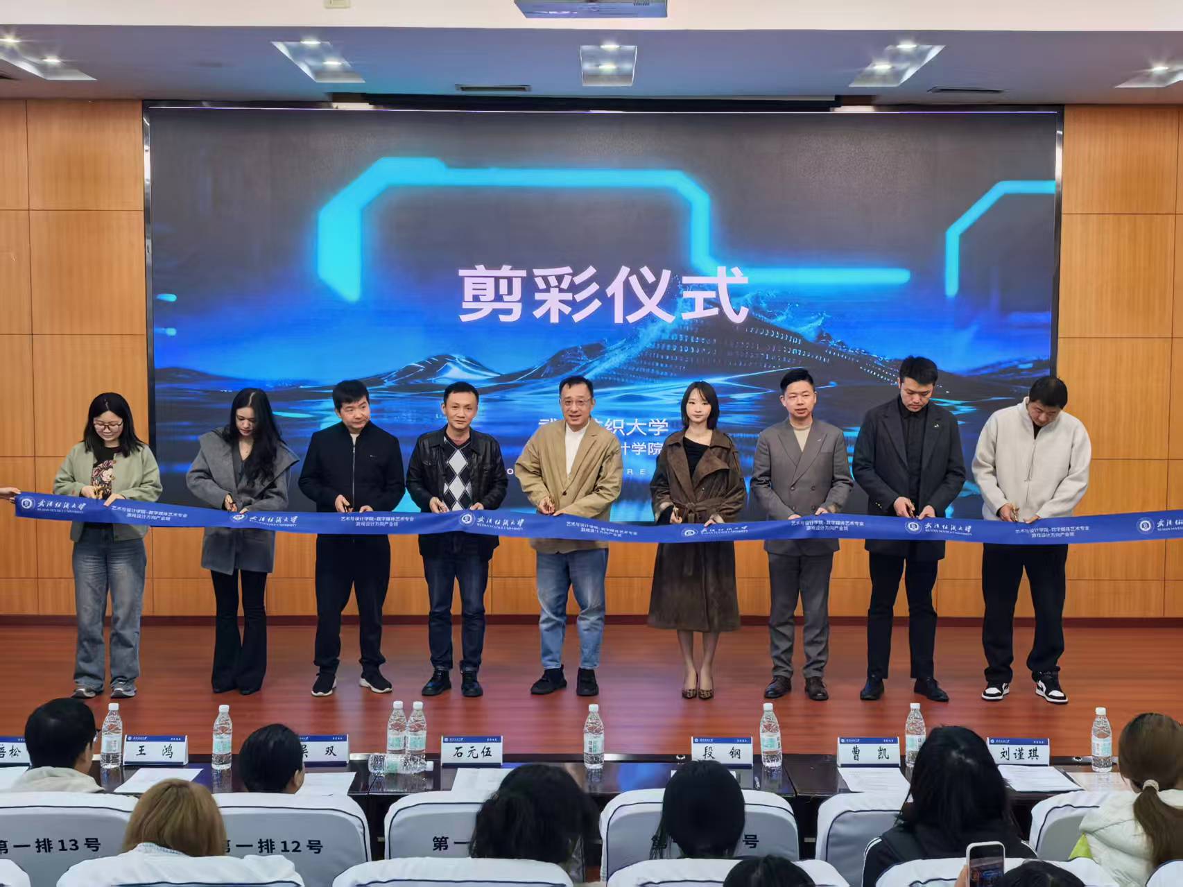 随后,段钢、石元伍与七家企业代表上台共同为数字媒体艺术专业(游戏设计方向)首届产业班开班进行剪彩。