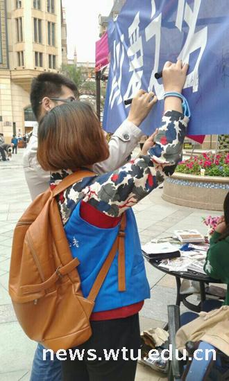 (宣传横幅上签名)