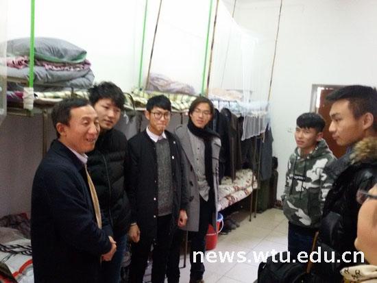 尚书记先来到南湖校区9栋615大二女生寝室,“冬天来了,冷不冷啊,多盖点被子啊”,尚书记和女生们亲切地交谈起来。看到女孩子们精心布置的墙纸、干净整洁的环境,他非常高兴,希望同学们能够继续保持,并且带动周围寝室,一起共创美好“家园”。