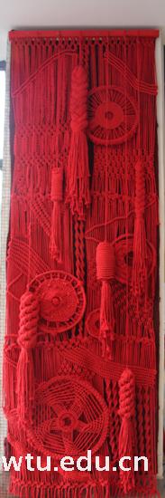 两幅作品均用大红色的八股绳手工编制而成,与展厅墙同高3米,宽1米。手编作品是染织11101班同学经过初稿设计,老师指导修改后历经然半个月编制而成。据同学们介绍说作品共分为3层,底部用麻袋染色缝制而成,中间一层是通过平结、蛇结、金钱结、麦穗结、锁边结和渔网结等手工编成的几何图形,寓意着2013整年的丰收果实,最上面一层再用结编出圆形,椭圆形的装饰物,使整个作品呈现出立体的效果。