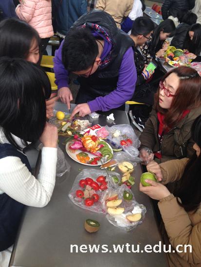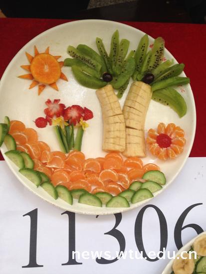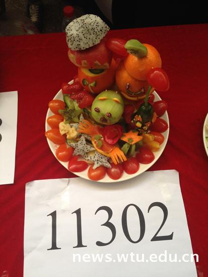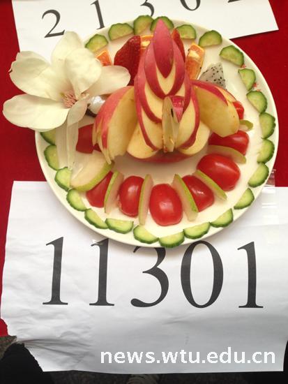 活动期间,采访了一名同学对本次比赛的看法,她说:“这次比赛挺有意思的,以前都不知道身边的同学还会雕刻水果,大家一起雕刻、拼盘,一起完成之前都没尝试过的东西,在提高动手能力的同时也增强了班级同学之间的凝聚力。”