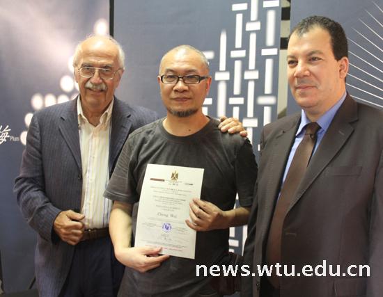 (意大利文化部部长和埃及驻意大利大使为程伟老师颁发展览证书)