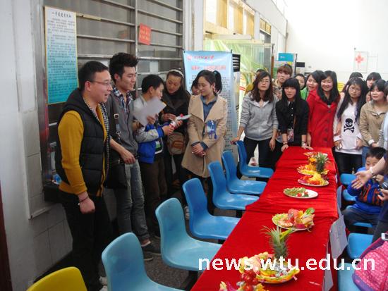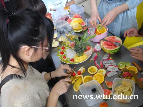 当天下午3点,活动在南湖校区员工食堂拉开帷幕。本次比赛共有14个以班级为代表参赛,每组6人。各参赛同学积极开动脑筋,不断创新,在比赛过程中互相帮助,有的切水果,有的摆造型,经过一轮紧张的制作,苹果、香蕉、草莓、橘子、黄瓜等各式水果、蔬菜,在同学们精细的刀工下,被改造成片、丁、丝、块等各种形状,拼放成各种图案,作品色彩艳丽,奇思妙想,精美绝伦。有的作品命名为“花开妇贵”,祈福母亲身体健康;有的作品命名为“同舟共济”,寓意纺大学子与母校同进步、共发展。作品充分展示了参赛员工的创新能力、动手能力以及感恩母亲、感恩母校的真挚感情。