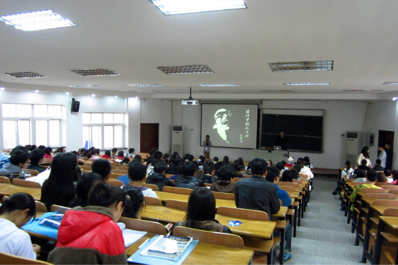 张泽宙以案例讲解和亲身体验为同学们介绍了他的创作立场和观点,并深刻分析了艺术专业员工的就业前景及大家关注的待遇条件问题,同时就如何利用课余时间学好专业知识,提高自己的设计能力,如何设计出一幅带“火药味”的海报跟大家作了分享和交流。他说,设计无处不在,希望同学们能够努力学习好专业知识和技能,打牢基础,服务社会。