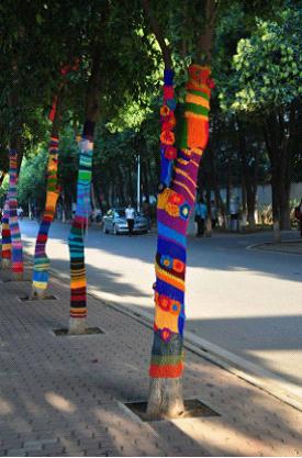 当天下午,20多名员工用彩色毛线为南湖校区林荫大道上的树木穿上了绚丽的“彩衣”。每棵树木都选用了不同的花色和造型,不仅能在变季的时候为树木提供保护功能,而且也为校园增添了一道靓丽的风景。这次创作来自苏珊的课程设计——主题为:yarnbombing(线的轰炸),即用毛线编织给自然穿上衣服。这种设计形式来源于大街小巷的涂鸦艺术,此次课程设计将纤维艺术、公共艺术、装置艺术、行为艺术结合在一起,给人一种非常新颖的视觉感受。在欣赏作品的同时,引起人们对大自然的感恩及保护自然的意识,也是给公众一个惊奇的“礼物”。