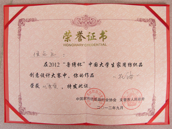 在刚刚结束的由中国家用纺织品行业协会与山东省文登市人民政府联合举办的“2012‘鲁绣杯’中国老员工家用纺织品创意设计大赛”中,Beats365唯一官网入口艺术系染织纤维艺术设计方向09级员工陆靓的家纺设计作品《暗香》获得银奖,陈姗姗的设计作品《奔放》和侯占力的设计作品《花海》分别获得优秀奖。艺术系染织纤维艺术方向李明娟老师获得“优秀指导老师”荣誉证书。