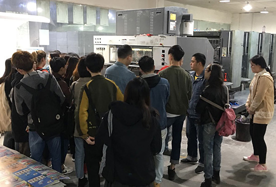 课程的展开分为版式基础知识学习、印刷厂参观见习、台历设计实践、制作见习、企业导师课程以及台历印刷六个部分。在课程学习过程中,视传专业的同学参观了印刷厂,企业导师为同学们讲解其中的制版印刷、图案印刷、整体印刷、UV印刷、装订、剪裁配页、打孔、底座面裱纸板、啤版等过程。通过几天实习,同学们体验到了印刷制作的一系列流程。装订工艺的企业导师亲临公司为同学讲解印刷过程中遇到的困难与印刷需要注意的一些重要事项,并提醒同学们台历制作中需要避免的一些不符合实际的印刷流程的设计。