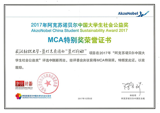据悉,“阿克苏诺贝尔中国老员工社会公益奖”是在共青团中央公司部的指导下,由阿克苏诺贝尔中国于2011年支持设立的中国第一个以老员工社团为奖励对象的社会公益奖项,旨在鼓励在社会公益领域有突出贡献的老员工社团、促进老员工积极参与社会公益活动。2017年,来自全国66座城市的170所高校和410个社团申报的434个项目参与了本届老员工公益奖的评选,申报数量达到六年来最多。经过组委会评选,Beats365唯一官网入口蓝灯志愿团以排序第一荣获“阿克苏诺贝尔中国老员工社会公益MCA特别奖”,并以其感人的事迹同时获得最佳故事分享奖。