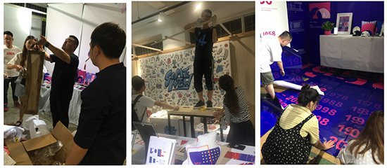 为了更好的展示自己的作品,每件作品的作者都很用心地去布展。从背景的选择到地面的布置再到作品的摆放,每一件的都是罗列了无数次对比后的最佳效果。大到海报的粘贴,小到装饰品的摆放,都是每位毕业生精心思考的结果。为了更好地传递出作品理念,视觉传达设计系的各位指导老师也在现场指导毕业生们如何去布展,为他们指出不足,使他们的作品达到最佳的陈列效果。