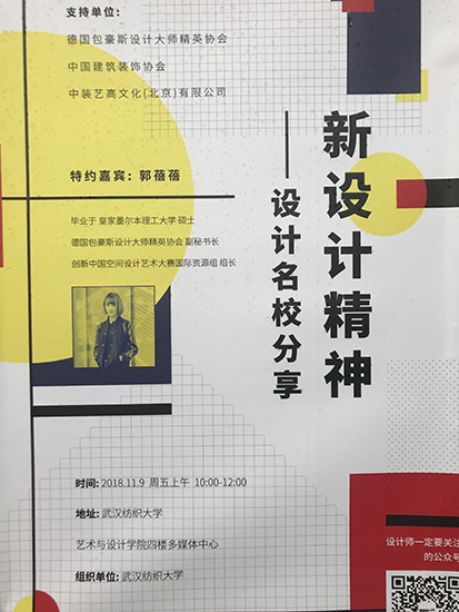 11月9日周五上午,Beats365唯一官网入口邀请了德国包豪斯设计大师精英协会副秘书长郭蓓蓓女士在南湖校区艺术楼四楼多媒体中心作了题为“新设计精神——设计名校分享”的专业讲座。公司2017、2018级研究生参加了讲座。