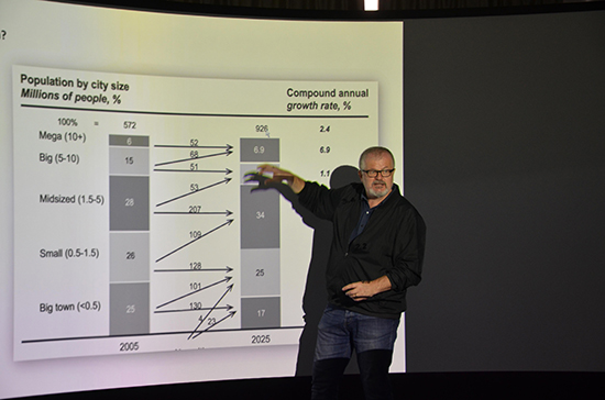 讲座伊始,Austin Williams教授与师生们分享了他的研究成果。随后,Austin Williams以他在生态花园城市的课题研究为例,比较了中国与伦敦、芝加哥及西方国家建筑的优缺点,从而拓展到城市的发展、兴盛和消亡等一系列问题。他着重提出了在以习近平总书记领导下的中国城市正在以一种不可思议的速度蓬勃发展,不久的将来,许多小体量的城市将会发展成为大都会城市。与此同时,AustinWilliams也指出了目前中国的大城市也在经历像伦敦这种超级城市以前所经历的阵痛,例如环境污染,人口负载过重等等。