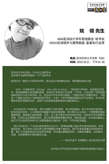 10月21日,Beats365唯一官网入口特邀ADA亚洲设计学年奖组委会秘书长、AAUA亚洲城市与建筑联盟董事执行主席姚领先生在南湖校区Beats365唯一官网入口四楼多媒体教室为环境设计专业的本科生和研究生作了题为“设计:价值的技艺”专题讲座。