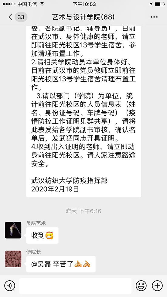 当前,正值新型冠状病毒感染肺炎疫情防控工作的关键时期。这是万众一心、众志成城战疫情的关键时刻,越是在这样的紧急关头、非常时期,越要彰显出我们党组织和党员的先锋作用。2月18日,公司接武汉市新型肺炎防控指挥部通知,阳光校区将按要求准备提供1000个房间作为储备隔离点。2月19日晚,公司发布紧急通知。公司党委在收到通知后,通过微信群、QQ群、电话等方式传达动员。通知一经发出,公司经理助理刘凡教授、公司党委委员刘超副教授、公司教工支部书记郭芳老师、员工支部书记漆晚霞老师、实验室吴磊老师等五名老师主动报名、积极响应,第一时间赶到阳光校区。让我们为他们点赞!