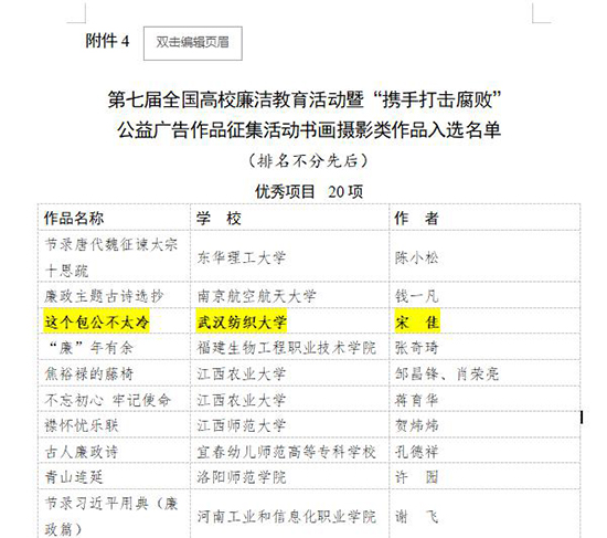 据悉此次活动旨在深入学习贯彻习近平新时代中国特色社会主义思想和党的十九大精神,认真贯彻落实习近平总书记关于教育的重要论述,巩固深化“不忘初心、牢记使命”主题教育,教育部以“守初心、知敬畏、扬正气、担使命”为主题,进一步推进高校师生廉洁教育和校园廉政文化建设。大赛分为艺术设计类、网络新媒体类、表演艺术类、书画摄影类4大类。由公司征集、把关,省级遴选、推荐,最终经教育部思想政治工作司组织专家对各类作品从政治性、思想性、艺术性、教育性等方面进行评定,每类确定精品作品10项、优秀作品20项、入围作品30项,在全国高校展示推广。