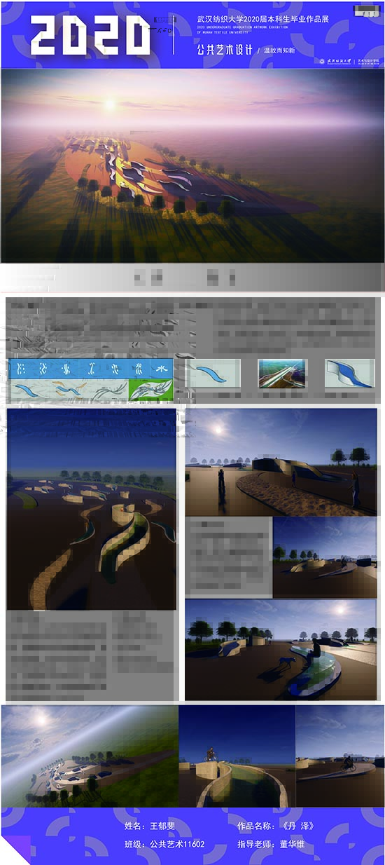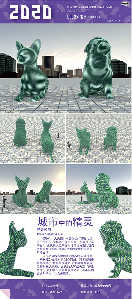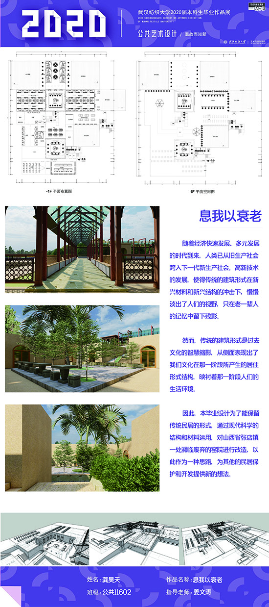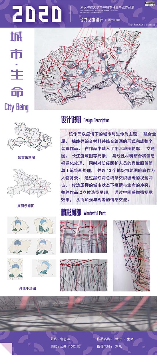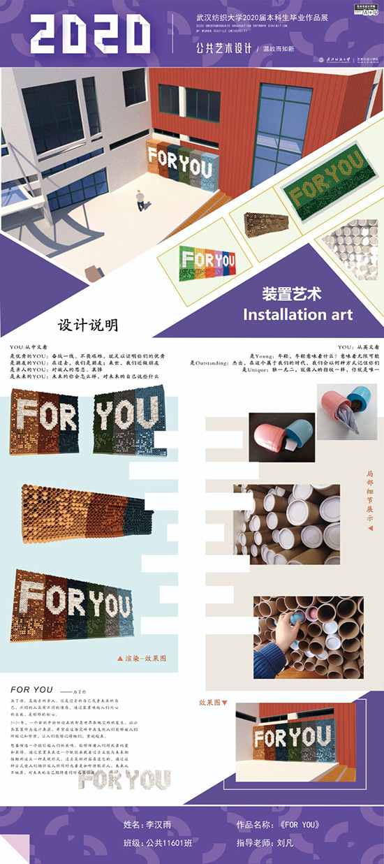 艺术改变了生活,让我们从新的视角去感受人生、体验社会、寻找生命的精彩。2020届公共艺术11601班同学们的毕业设计作品,围绕着同一个主题—温故而知新,在这些作品里能够看到每一位同学对世界、对自我的不同认知和思考,在不同的艺术形式中,我们感受到了无限的活力和想象力,并被作品丰富的创造力深深触动。毕业设计作品凝聚了同学们四年的心血,体现了我们对公共艺术的认知与创新。由于疫情原因,2020届是一群特殊的毕业生,伴随在学习和创作过程中的艰辛和迷茫都是值得珍惜的经历,所有的付出都有目共睹,这一切都将是青春最珍贵的记忆。