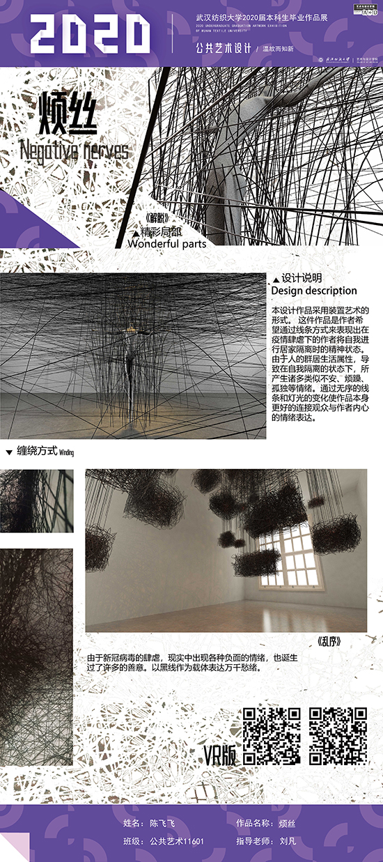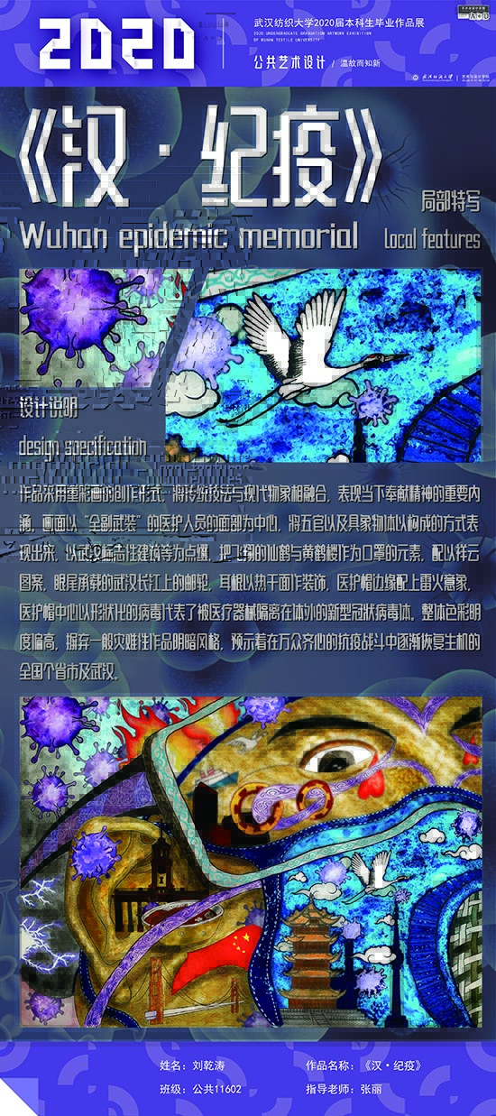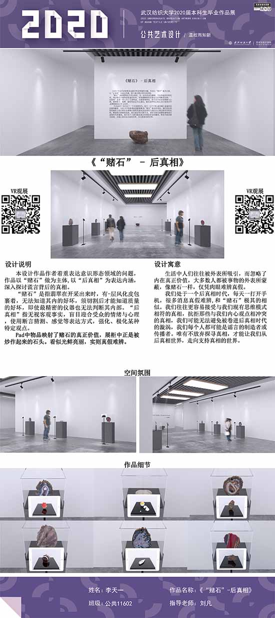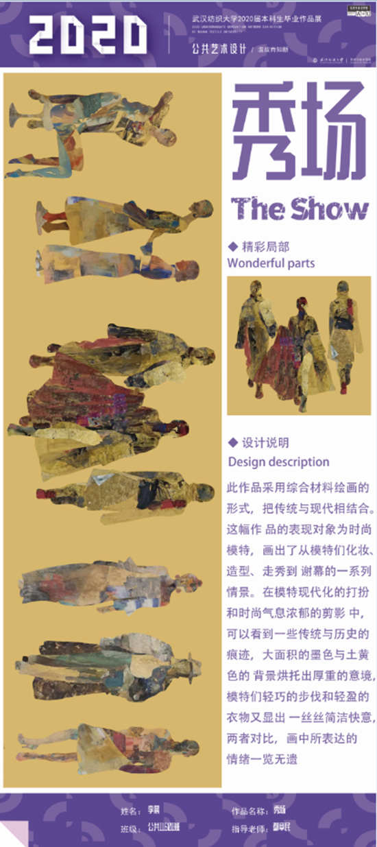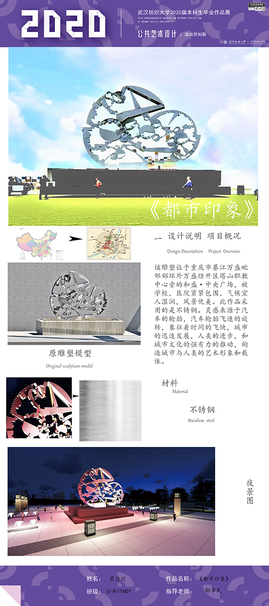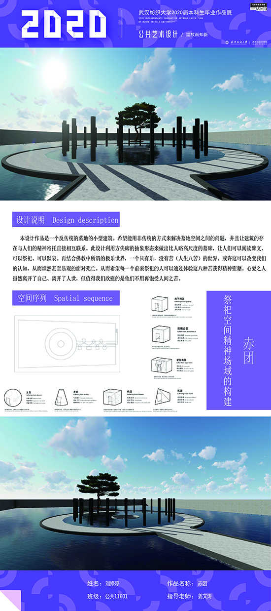 艺术改变了生活,让我们从新的视角去感受人生、体验社会、寻找生命的精彩。2020届公共艺术11601班同学们的毕业设计作品,围绕着同一个主题—温故而知新,在这些作品里能够看到每一位同学对世界、对自我的不同认知和思考,在不同的艺术形式中,我们感受到了无限的活力和想象力,并被作品丰富的创造力深深触动。毕业设计作品凝聚了同学们四年的心血,体现了我们对公共艺术的认知与创新。由于疫情原因,2020届是一群特殊的毕业生,伴随在学习和创作过程中的艰辛和迷茫都是值得珍惜的经历,所有的付出都有目共睹,这一切都将是青春最珍贵的记忆。