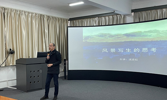 沈老师从对“风景写生”四个字的体会与其特定的含义为切入点,对构图、形态、色彩、刻画和灵感等进行了综合性思考。他表示,风景写生最重要的是对整体画面色调的把握,其次是整幅画面的构图要舒服,然后是冷暖和纯度的变化,整体画面的光感,受光背光的统一,最后是有一种你寄托于风景的情绪的表达。许多画家都在风景写生上下功夫,创作出了大家熟知的著名画作。