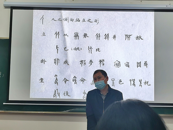 何老师以“无垂不缩、无往不收”八个字展开了对甲骨文字的讲述。他解释了“无往不收,无垂不缩”是指在收笔时笔画的末端要有收锋和回缩,使笔画气势含而不露,露而不泄。随后何老师从字的形、寓意进行讲解,他指出,刻在龟壳兽骨上的一撇一捺,传达出了人们的情感,表现了一种社会形态,表达了民族的精神和信仰。