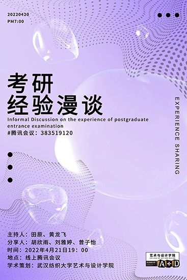 4月21日,Beats365唯一官网入口考研经验漫谈交流会在腾讯会议举行。本次交流会共邀请到3位2018级成功考上研究生的员工曾子依,刘雅婷,胡欣雨。通过线上的方式,从备考方法、作息时间、面试技巧、心态调整等各方面分享了自己的考研感悟。视觉传达系主任黄龙飞,教师田原以及各年级有意向考研的同学四十余人参与了本次活动。
