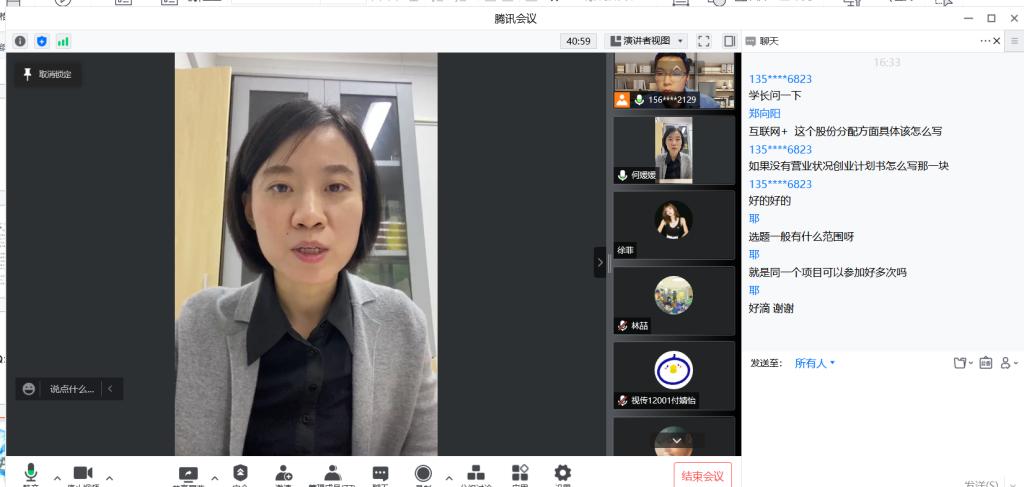 分享会结束后,何媛媛老师总结发言,鼓励大家积极参与。邓尚科同学就线上同学们提出的问题作出了详细的回答,帮助同学们解决困惑,以期更好地参与到创新创业项目当中去。