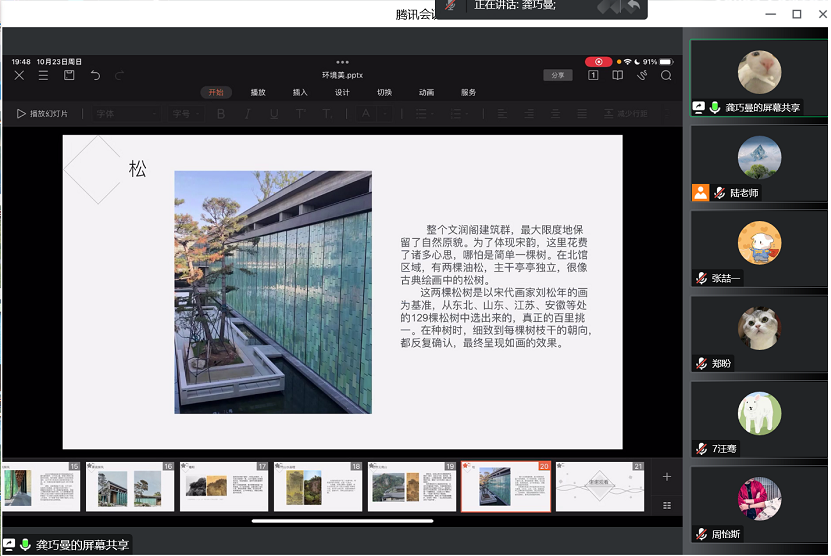 本次论坛由两班同学分8组依次汇报,中间有“老师点评”、“员工抽签随机互评”和自由讨论的环节,同学们与老师积极互动并参与讨论,氛围轻松、愉悦。本次汇报最突出的是郭嘉慧的小组,该小组探讨杭州国家版本馆宋韵美的体现,从龙泉青瓷屏扇门、青铜覆面双曲瓦片、东方韵味竹纹清水混凝土等东方元素的材料美,融汇现代和古典、中国和西方的建造之美去层层阐述国家版本馆宋韵美的实现,内容充实,条理清楚。