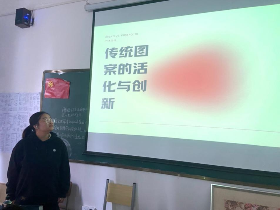 工艺美术11901班韦雪清组的几位同学对比分析了中国装饰图案和国外装饰图案在造型、色彩和文化内涵上的不同,并结合自身的设计案例,让大家对中国传统图案有了多角度的认知。