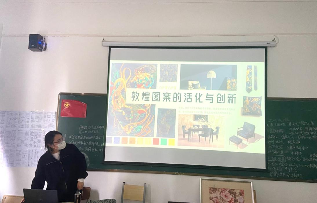 工艺美术11901班的杜思滢同学带来了关于敦煌图案的活化与创新案例分享,她通过自己的设计实践案例阐述了原创纹样的设计过程。她选择了传统敦煌图案中的飞天元素和传统乐器元素,并用中国传统岩彩的形式表现,将传统图案与现代感结合,并衍生出相关系列产品的制作思路。