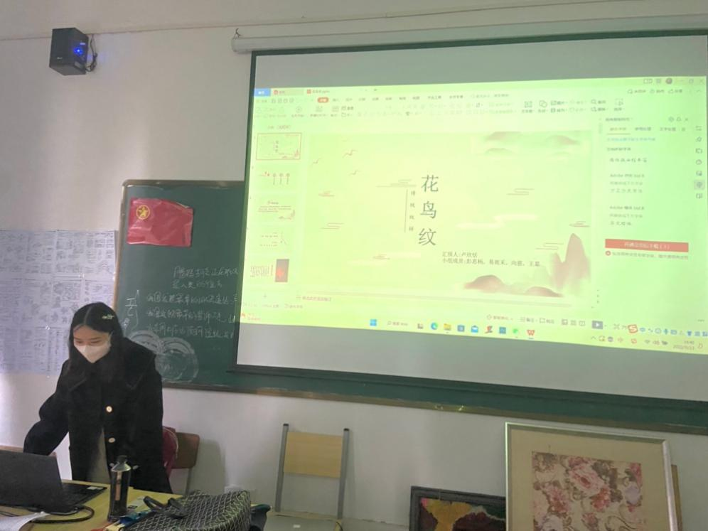 工艺美术11902班卢欣恬组的成员们从“经典之魂”、“感悟当今”和“崇尚未来”三个方面向大家展示了传统花鸟纹在不同艺术载体上造型色彩特点以及在家居纺织品和文创产品上的创新应用。