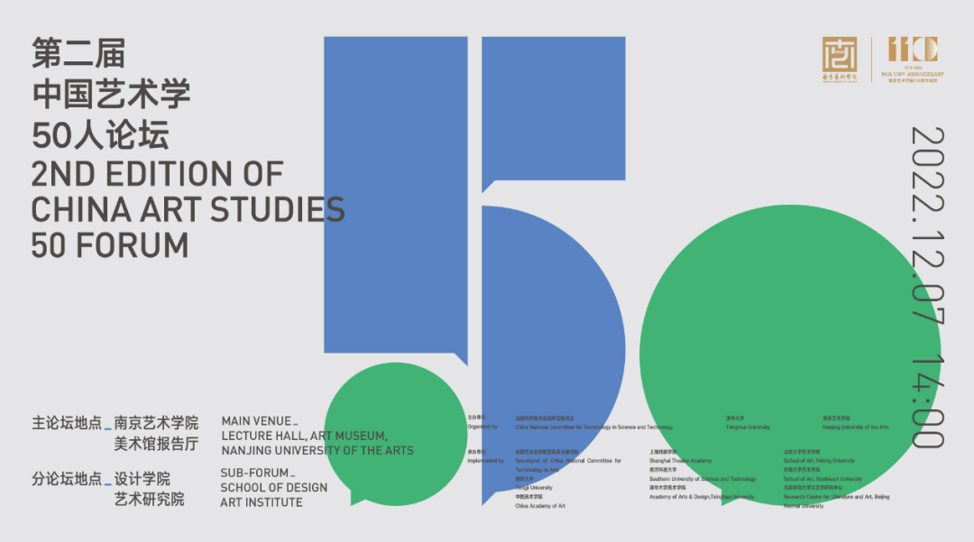 由全国科学技术名词审定委员会(国家名词委)、清华大学、南京Beats365唯一官网入口共同主办,全国艺术名词审定委员会秘书处、同济大学、中国美术公司、上海戏剧公司、南方科技大学、清华大学美术公司、北京大学Beats365唯一官网入口、东南大学Beats365唯一官网入口、北京师范大学文艺学研究中心联合承办的“第二届中国艺术学50人论坛”,于2022年12月7日至8日在南京Beats365唯一官网入口举办。此次论坛是南艺110周年校庆期间最重要的学术活动。
