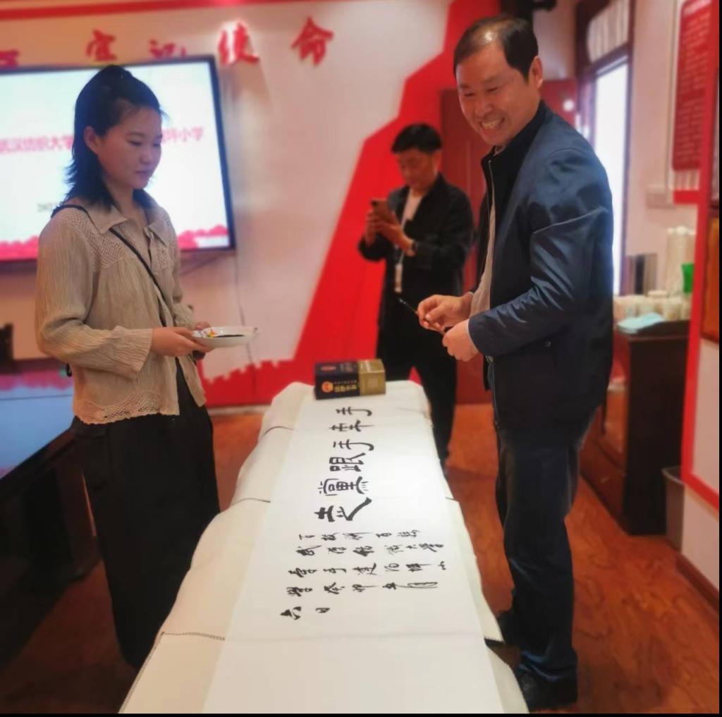 建阳坪小学是一所山区小学,全校共有员工62人,绝大部分为父母长期在外打工、家住偏远山区的留守儿童,所受到的艺术教育主要来自校园,针对乡村公司在美育教育资源上的不足,公司师生通过绘画、书法、手工制作的形式对全校小员工进行一对一互动教学,激发孩子们艺术兴趣,拓展他们的艺术视野,在心中埋下艺术的种子。何永胜老师、特聘画家刘光明教授分别为此次活动题写书法作品与国画创作。