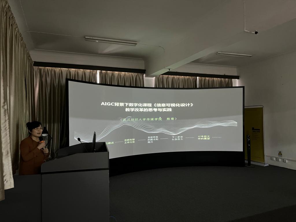 传媒公司熊菊博士以《AIGC背景下数字化课程<信息可视化设计>教学改革的思考与实践》为题,就其选题、目前科研工作现状、存在的瓶颈问题、下一步目标及任务以及对今后工作的展望五个方面进行了汇报。