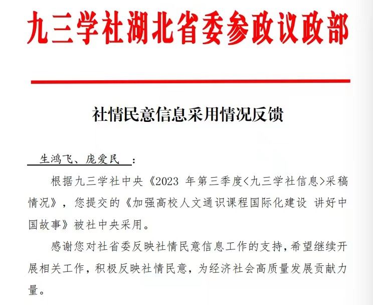 公司教师提案《加强高校人文通识课程国际化建设 讲好中国故事》被中央《九三学社信息》采用、《非物质文化遗产智能展示与传播样态调研报告》被文化和旅游部恭王府博物馆、中国纺织工业联合会、湖北省政协、湖北省教育厅、海南文旅厅等政府部门采用。