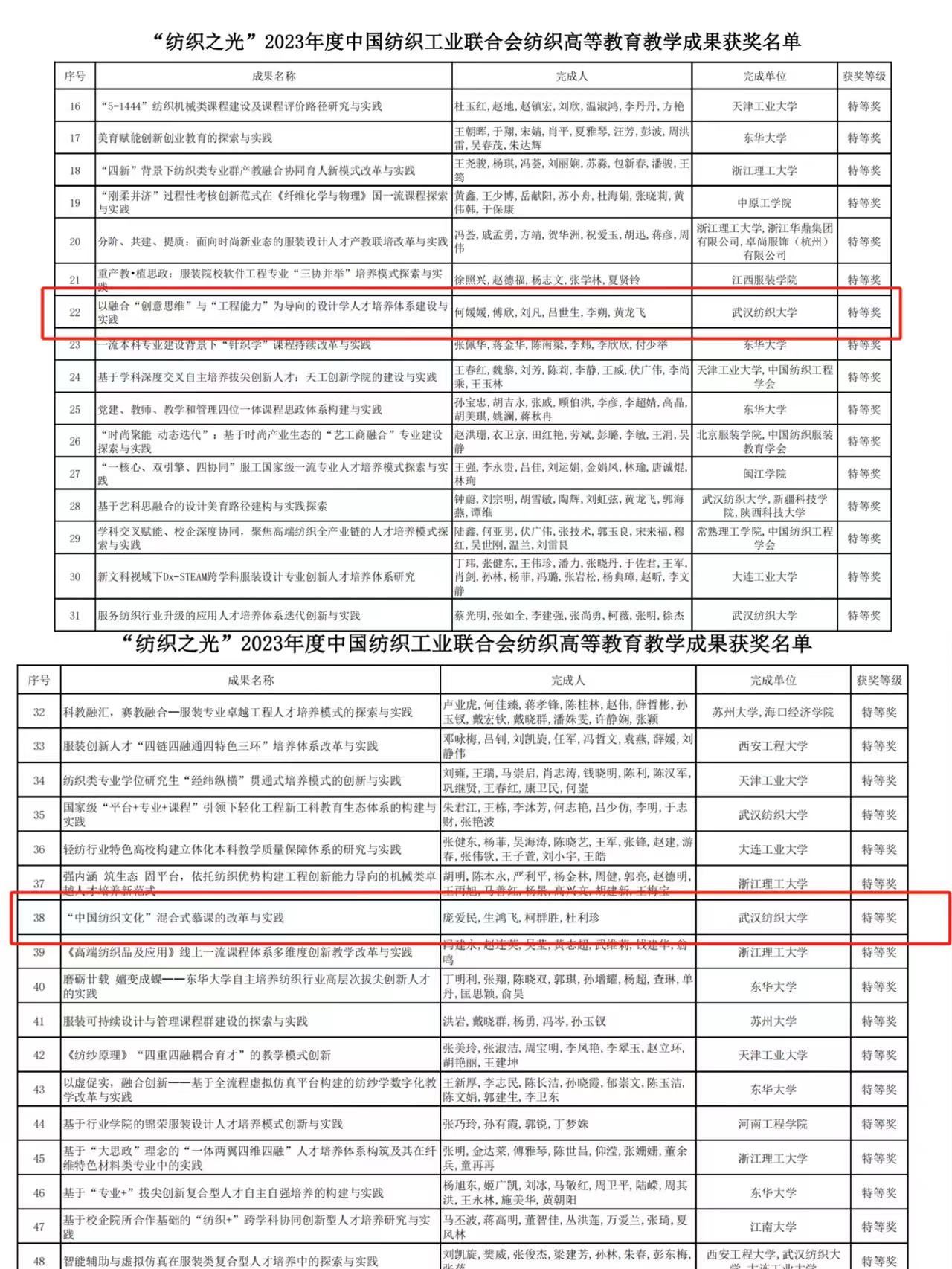 公司教师成果获“纺织之光”2023年度中国纺织工业联合会纺织高等公司产品成果奖6项,其中何媛媛的《以融合“创意思维”与“工程能力”为导向的设计学人才培养体系建设与实践》、生鸿飞的《“中国纺织文化”混合式慕课的改革与实践》获特等奖。