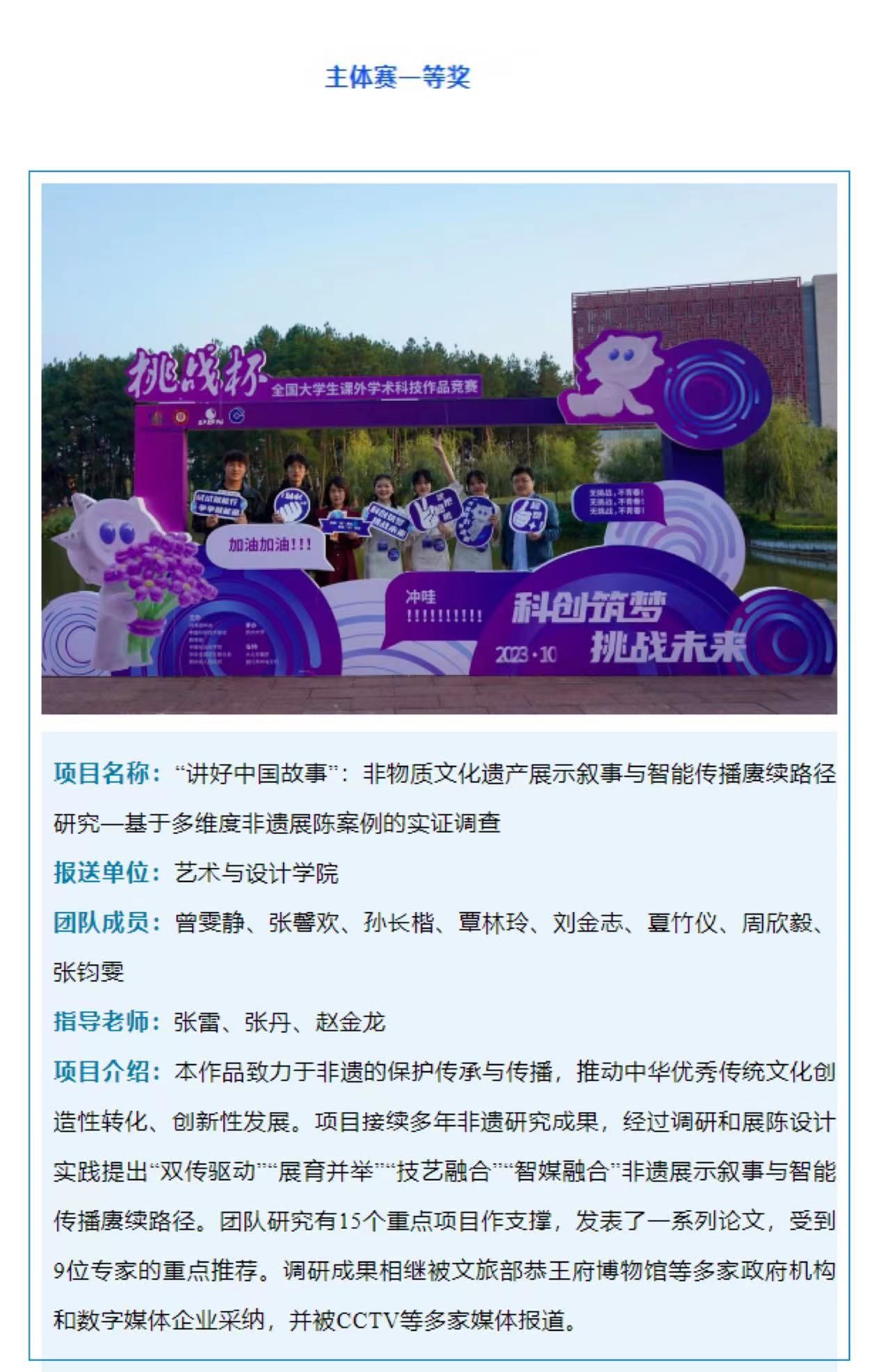 公司项目《“讲好中国故事”:非物质文化遗产展示叙事与智能传播赓续路径研究—基于多维度非遗展陈案例的实证调查》荣获第十八届“挑战杯”全国老员工课外学术科技作品竞赛主体赛全国一等奖。