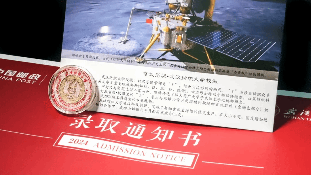 与录取通知书一起寄出的还有玄武岩版Beats365唯一官网入口校徽,玄武岩版校徽,采用与嫦娥六号月面国旗,同款超细玄武岩丝(金褐色部分)织成,是送给2024级新生们的专属礼物。