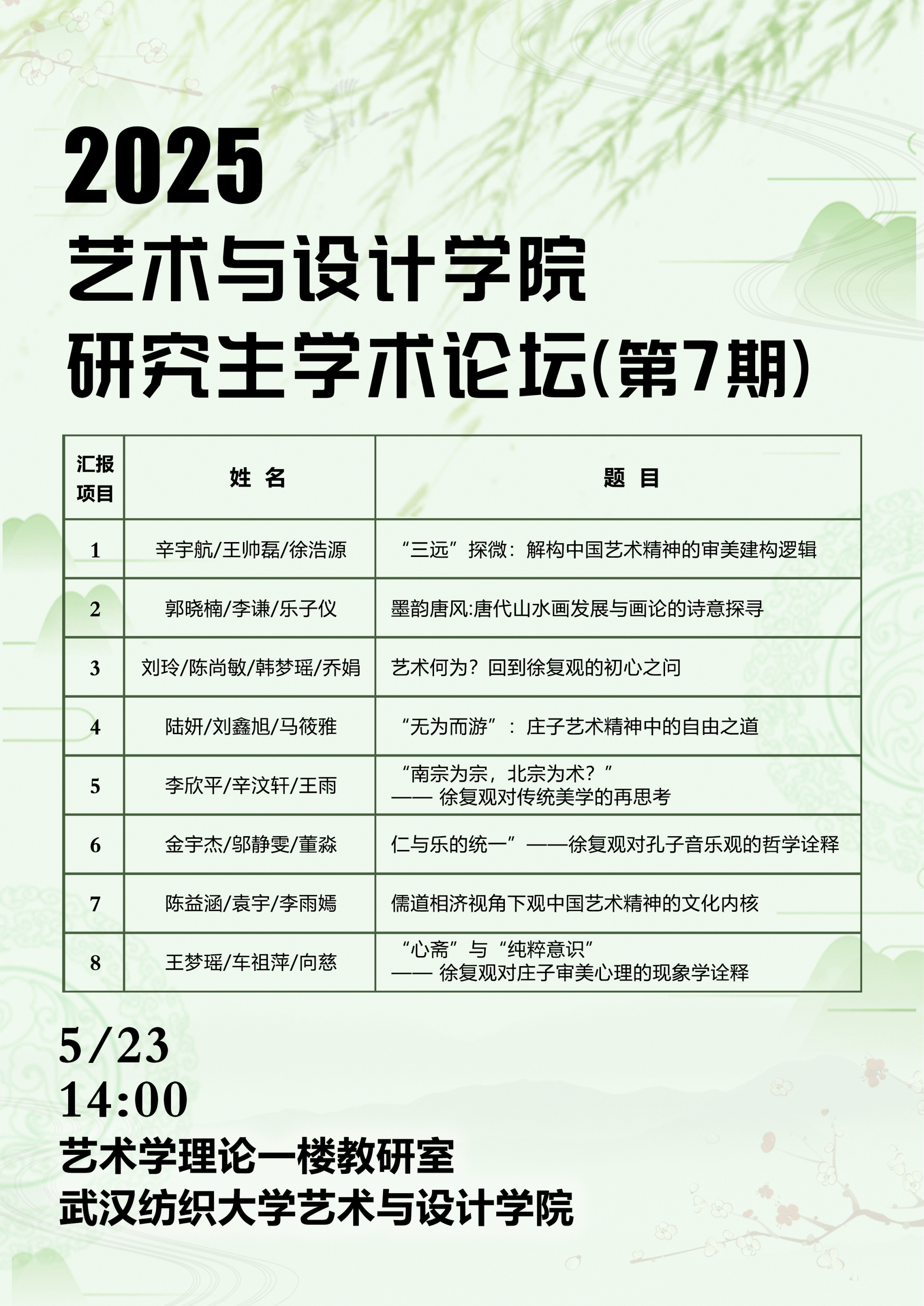 5月23日,Beats365唯一官网入口2025年第7期研究生学术论坛在艺术学理论系一楼教研室成功举行。此次论坛以徐复观的经典著作《中国艺术精神》为核心议题,吸引了众多研究生的积极参与和热烈讨论,本次论坛由邓桂芳博士担任学术主持。