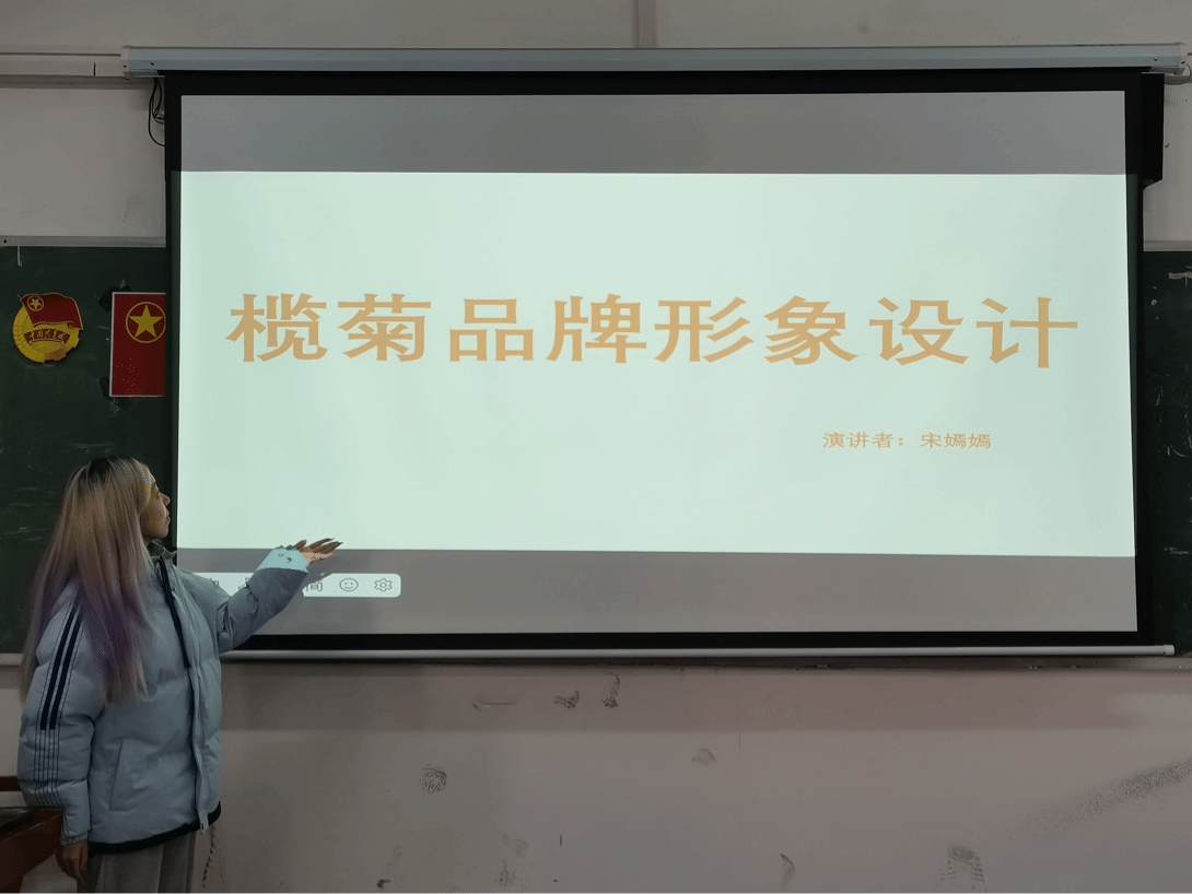 宋嫣嫣同学聚焦品牌设计领域,汇报主题为《榄菊品牌形象设计》。她的设计并非单一的视觉创作,而是构建了一套完整的品牌视觉体系,包括辨识度极强的logo设计、贴合产品特性的包装设计、富有亲和力的IP形象设计,以及涵盖名片、信封、工作证等的全套办公系统设计。整个设计围绕“品牌年轻化”展开,通过明快的色彩搭配、简约的线条语言,打破了榄菊的传统品牌印象,让经典品牌与年轻消费群体的审美需求产生共振,为品牌注入新的市场活力。