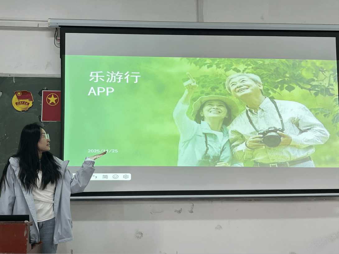 江思琪同学将设计视角转向适老化领域,分享主题为《乐游行——适老化旅游类APP设计》。她针对老年人旅游时的记忆留存需求,设计了一整套功能完备的APP系统,核心特色在于“视频定位记忆”功能:老年人拍摄旅游视频后,APP可自动定位视频拍摄地点,并关联当地景点介绍、游览时间等信息,帮助老年人后续回顾时能快速唤醒场景记忆。此外,APP界面还优化了字体大小、操作逻辑,充分考虑老年人使用习惯,实现了技术功能与老年群体需求的精准共振。