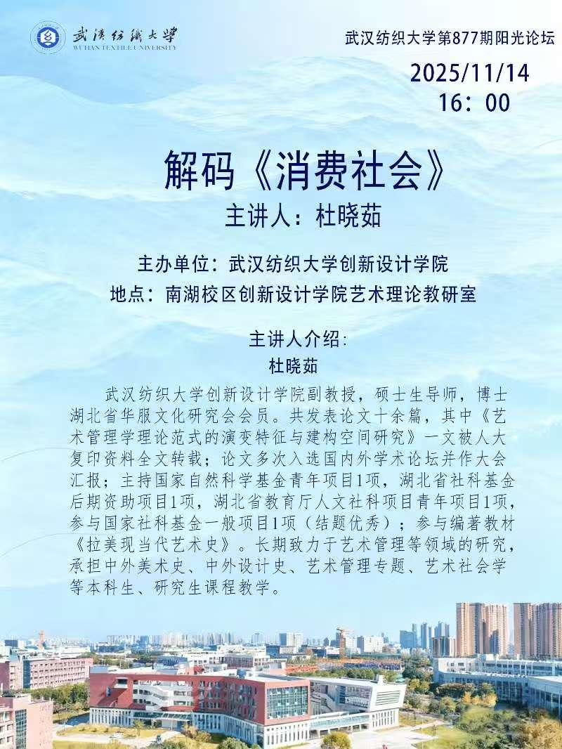 讲座中,杜晓茹副教授将以让·鲍德里亚的《消费社会》理论为框架,系统解读消费如何从物质满足演变为构建身份与意义的符号体系。她将结合时尚品牌、网红展览等当代文化现象,剖析艺术与设计如何在消费逻辑中扮演符号生产与传播的关键角色,并进一步引导师生反思艺术教育与实践如何面对消费主义浪潮,探索批判性创作与可持续设计的可能路径。讲座注重理论与现实案例的结合,旨在为艺术、设计及管理领域的思考提供新的分析视角。