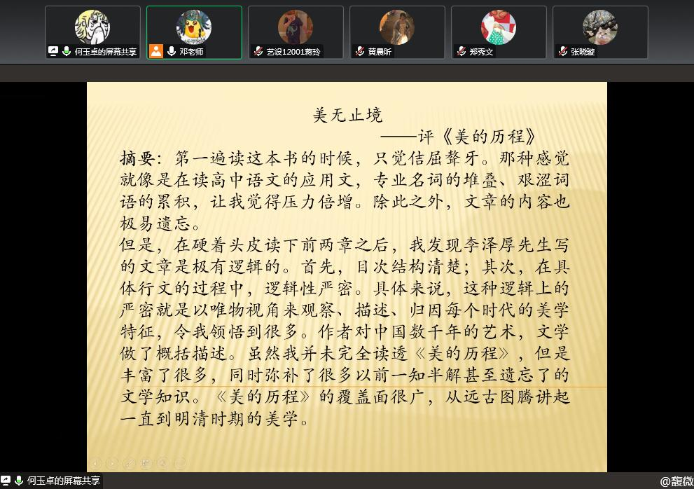 整场活动中,除了每组同学就特定小主题进行分享之外,还有老师补充、提问以及其他同学提问、表达见解的互动环节。最后,邓老师作总结,李泽厚的《美的历程》一书,虽然是系统地研究了中国远古时期至明清时期的艺术文化,但却是指向未来的,不仅美是指向未来的,美的创造和美的生活也是指向未来的。因此该书值得一读再读。