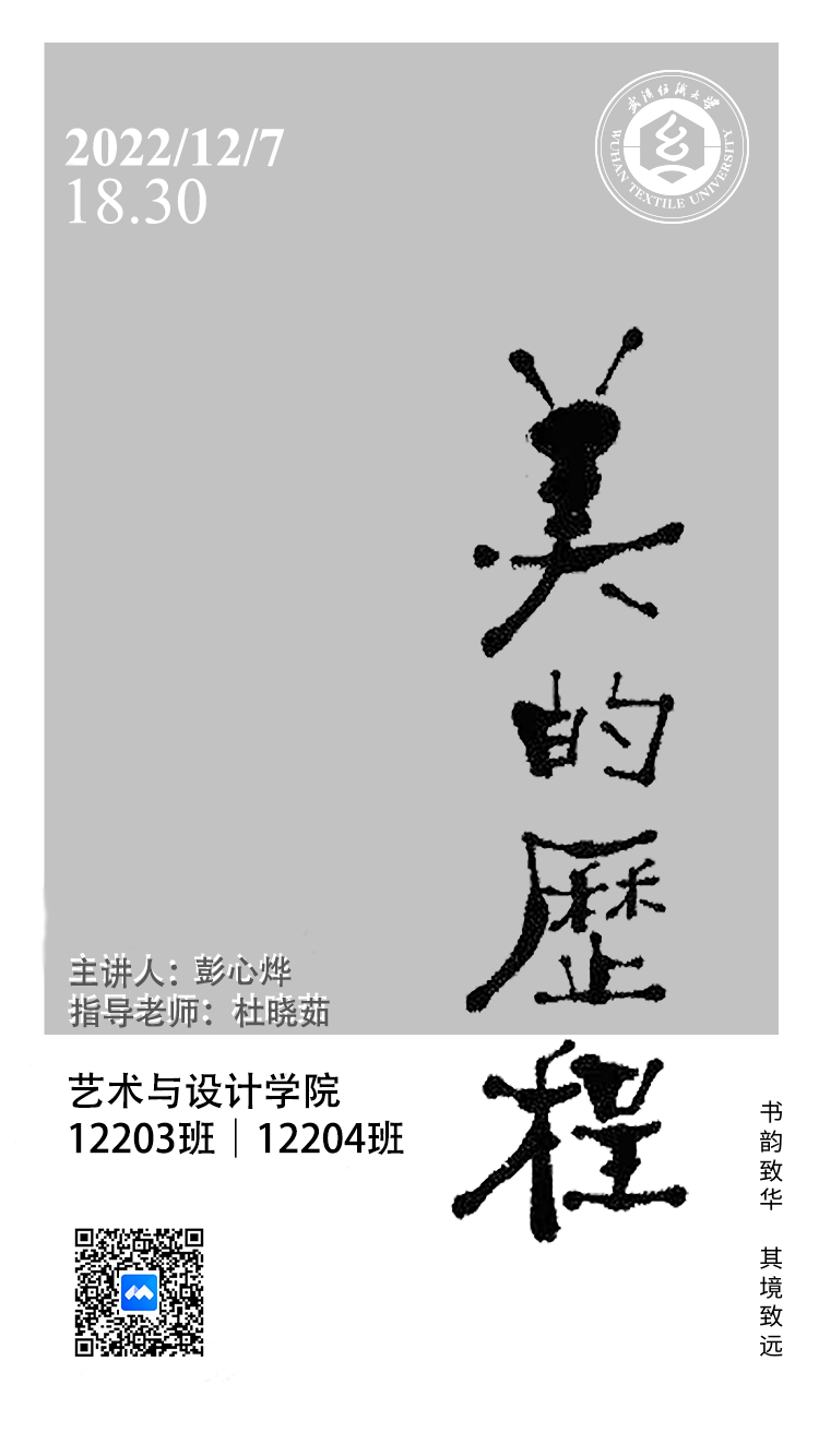 我们常说:“书籍使人进步。”为了让同学们对自己的专业更加了解,更加投入于专业学习,2022年12月7日晚,杜晓茹老师发起了一场以《美的历程》为主题的本科学术沙龙,这次活动以线上会议的形式进行,艺术与设计学12203、12204班参与了此次活动。