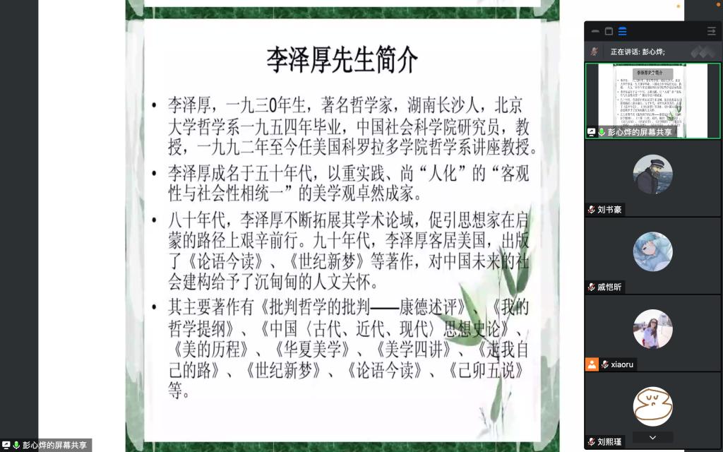 学术沙龙开始,杜晓茹老师就先对此次活动的意义和目标进行了讲解,并请作读书汇报的同学按照班级顺序依次进行汇报。