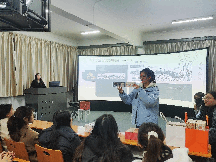 12102班马语嫣、左依凡、张译丹、魏雁南小组同学分享的主题为“湖北非遗文化创意包装设计”,以承载众多非遗文化的宜昌为中心,提取宜昌非遗文化夷陵版画作为设计基础,用插画的形式将非遗文化展现出来。在包装设计上以创意字体拼图的形式增加趣味性、生动性,并以此为基础图案进行明信片、杯套等一系列文创产品设计,增加整套作品视觉美感与艺术感染力。