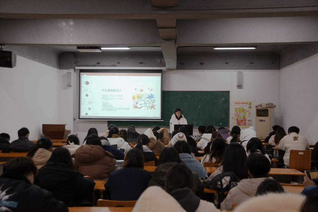 谢婉静同学汇报的题目是《插画基础设计知识与拓展研究》主要介绍的基础知识包括:插画设计的定义、作用、应用等。并解释它们在海报设计中的重要性和应用方法。内容涉及巩固基础知识,回忆素描技法,以及后续延伸到设计上是如何转变。同时也介绍了一些相关基础设计的手法,以及在实际案例中的运用等。