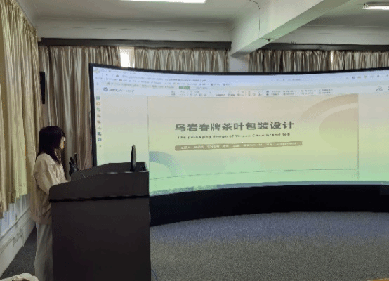 魏雁南同学汇报主题是《乌岩春牌茶叶包装设计》,其设计注重地方文化与产品的结合,体现了茶叶的高端品质。该作品不仅深入挖掘了乌岩春茶叶的文化内涵,更通过新颖的设计表现形式,将品牌故事与消费者的情感紧密相连。魏雁南同学的设计在保持传统茶文化精髓的同时,巧妙融入现代审美理念,使得包装设计既具有艺术性,又具备市场竞争力。
