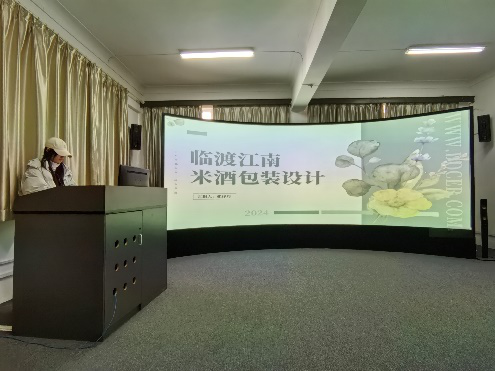 最后一位汇报的是张译丹同学,她的汇报主题是《临渡江南米酒包装设计》,其作品以临海地方文化为背景,提取了临海的一些特色建筑元素,再结合插画形式来表现米酒的制作工艺,通过两种元素的融合所设计的包装图形既新颖,又富有临海的地域特色,也传递了米酒的人文意境和自然情趣,同时还增强了产品与地区的关联性,突显了产品的独特性和吸引力。