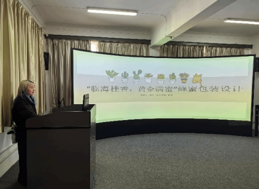 视传12102班的宋冉同学汇报的主题是《临海桂香,‘黄金’满蜜包装设计》,其设计以临海地区的特色农产品桂花蜜为灵感来源,借鉴了吴冠中大师的水墨画风格,较好地展现了地方特色与现代设计的完美结合。
