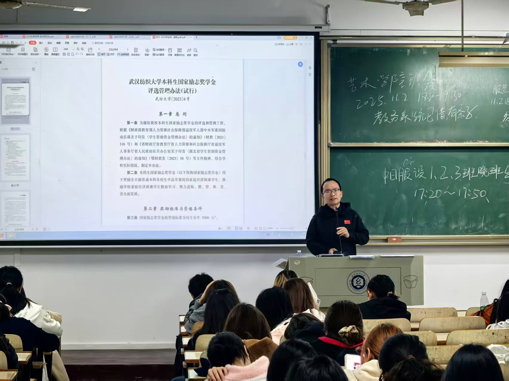 会上,各年级各班还进行了奖助学金评选宣讲和评优评先宣讲,辅导员详细讲解了奖助学金申报评审工作的国家政策、指标分配、申报条件、评审程序等内容,介绍了评优评先名额分配、申请条件和评审管理办法,鼓励符合要求的班级和个人积极申报。