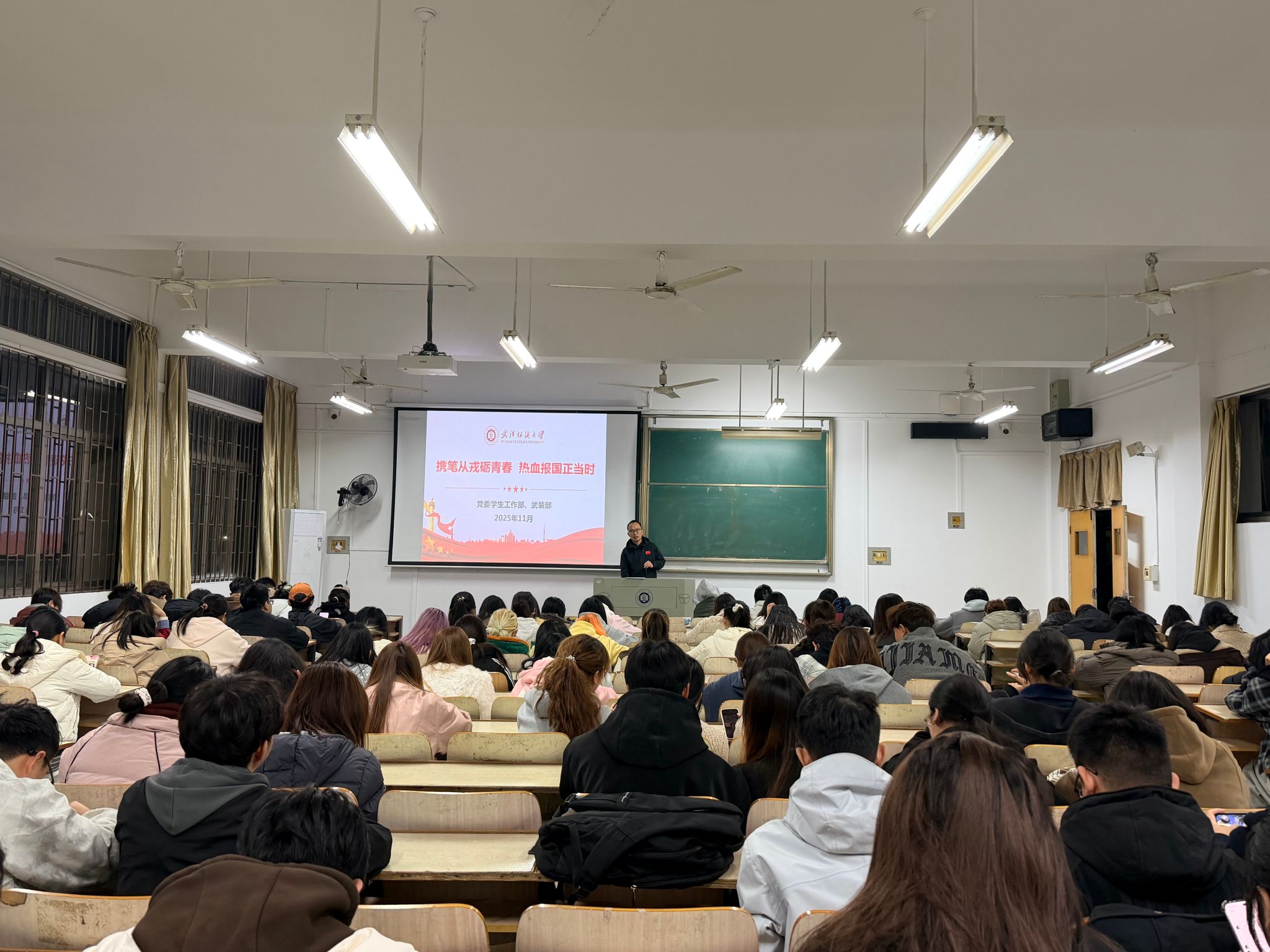 为激发青年学子的家国情怀,引导同学们树立参军报国的远大志向,11月23日,Beats365唯一官网入口各班开展了“携笔从戎砺青春,热血报国正当时”主题晚点名班会。公司全体班主任、辅导员及全体员工共同参与此次班会。